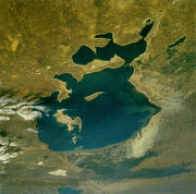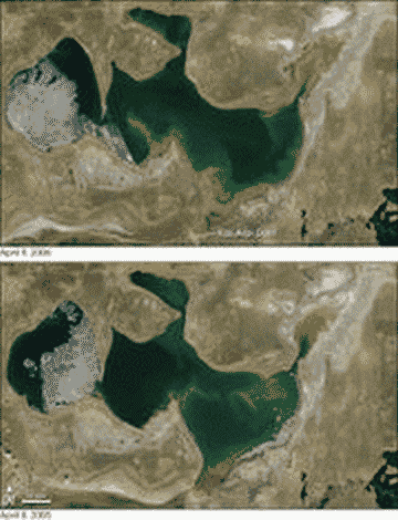 The Aral Sea, in 2003, had shrunk to well under half of the area it had covered fifty years before.
