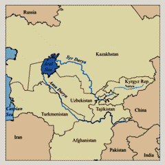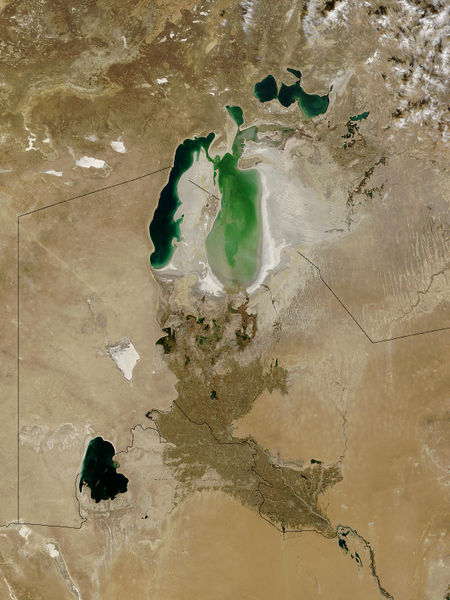 The Aral Sea (Kazakh: Aral Tengizi, Uzbek: Orol dengizi,) is a landlocked endorheic sea in Central Asia; it lies between Kazakhstan in the north and Karakalpakstan, an autonomous region of Uzbekistan, in the south. Since the 1960s the Aral Sea has been shrinking, as the rivers that feed it (the Amu Darya and the Syr Darya) were diverted by the Soviet Union for irrigation. The Aral Sea is heavily polluted, largely as the result of weapons testing, industrial projects, and fertilizer runoff before and after the breakup of the Soviet Union.